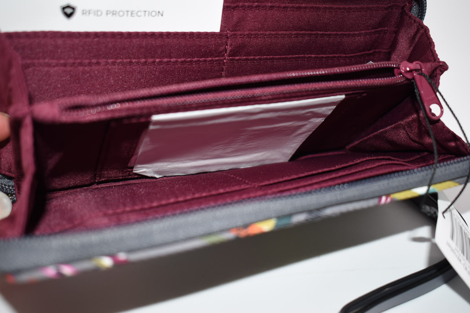 This wristlet promises peace of mind on the fly with streetwise RFID protection. The compact, compartmentalized design keeps every card and coin in order.