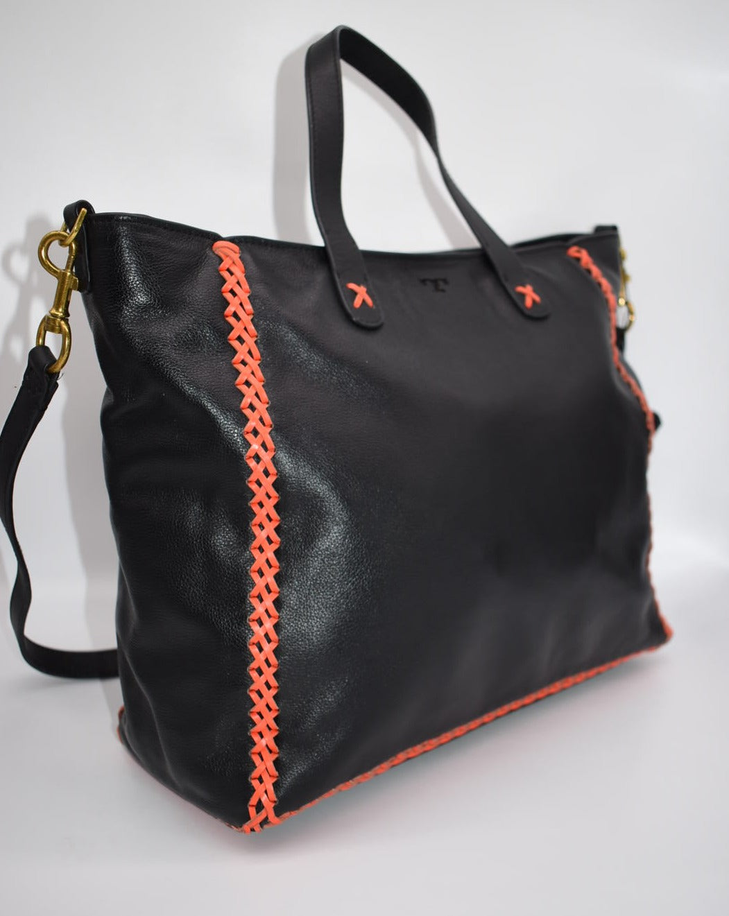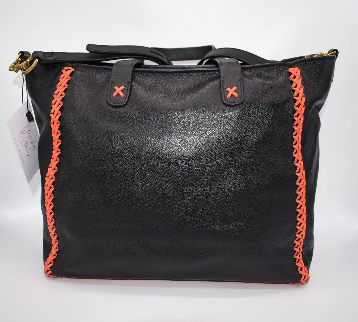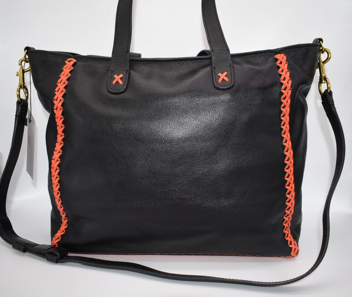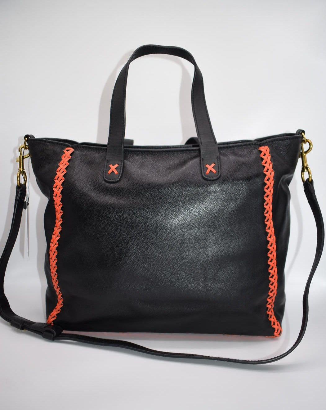 Color-pop whipstitching livens up a lightly structured tote made from pebbled leather and topped with easy handles and an optional, adjustable shoulder strap. Lightly structured silhouette with flat base for stability Leather.