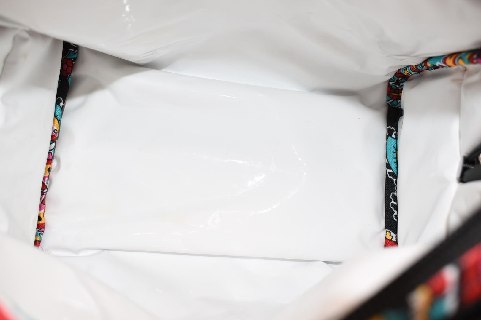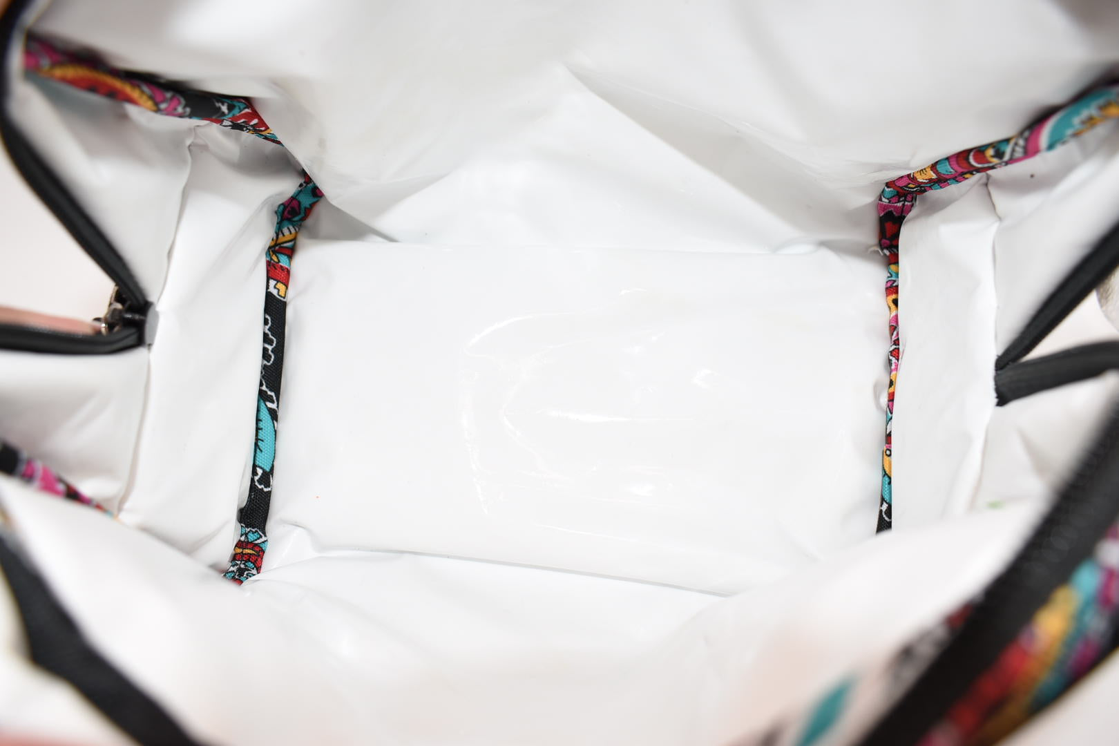 Fashionable and functional, this lunch box sports a vibrant pattern, while a zip closure and lined interior keep contents secure. An ID card window completes the style.
