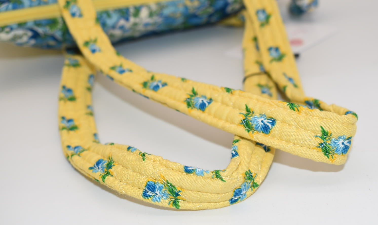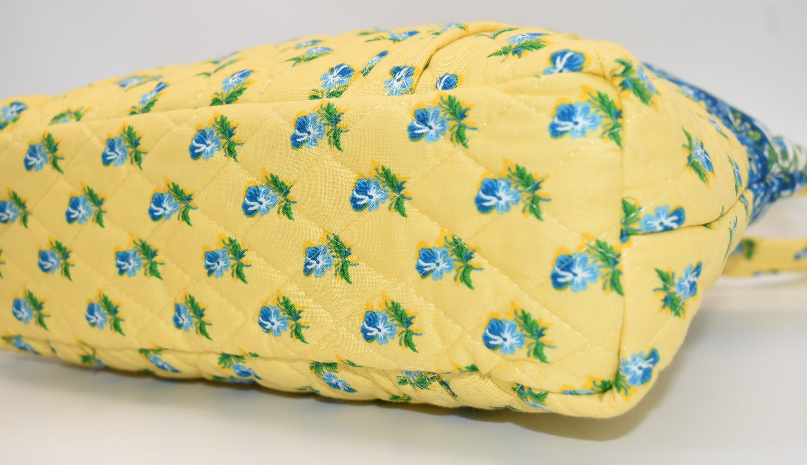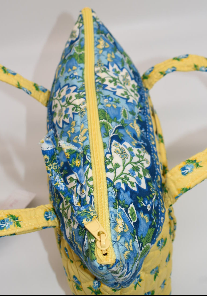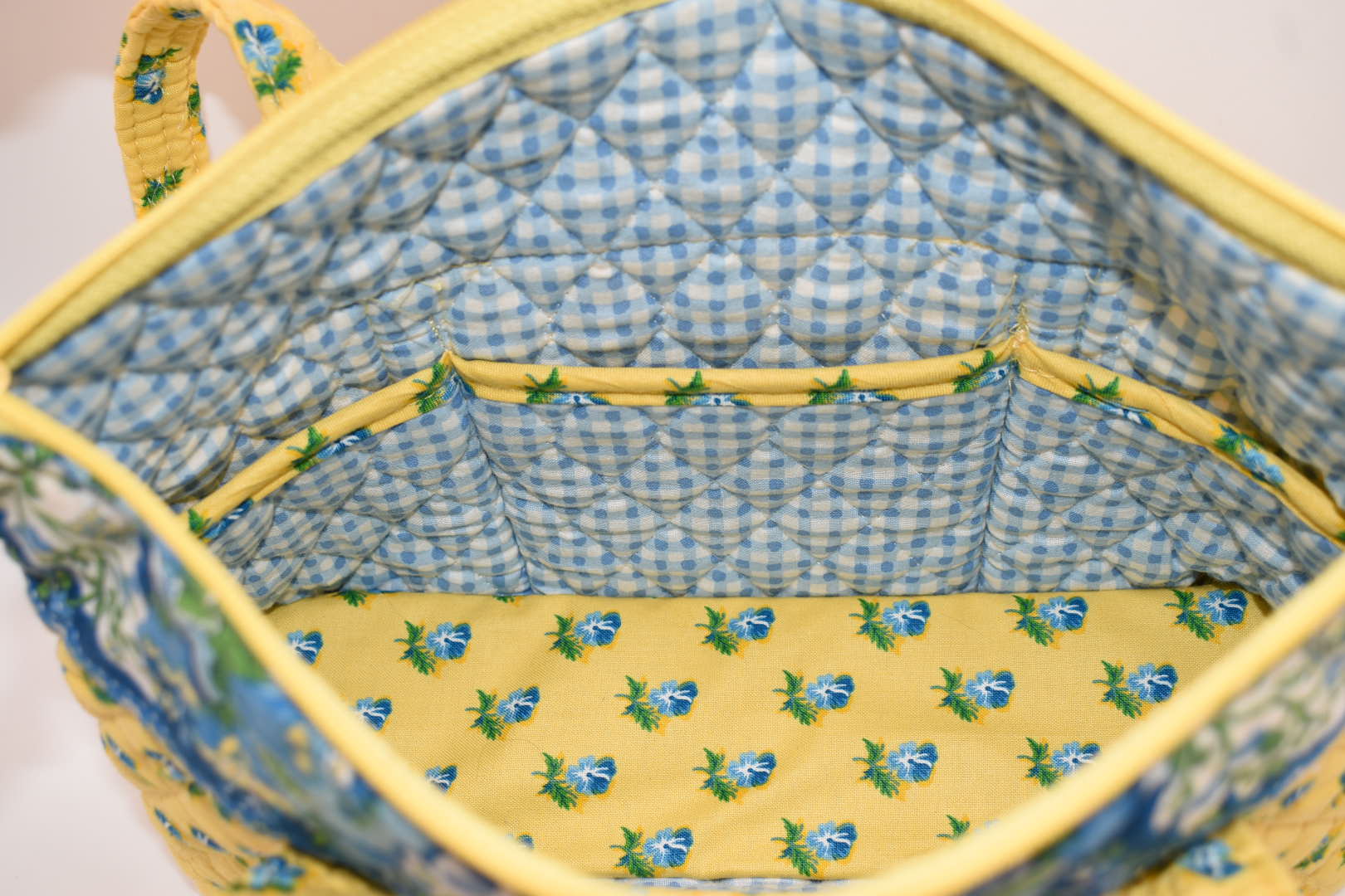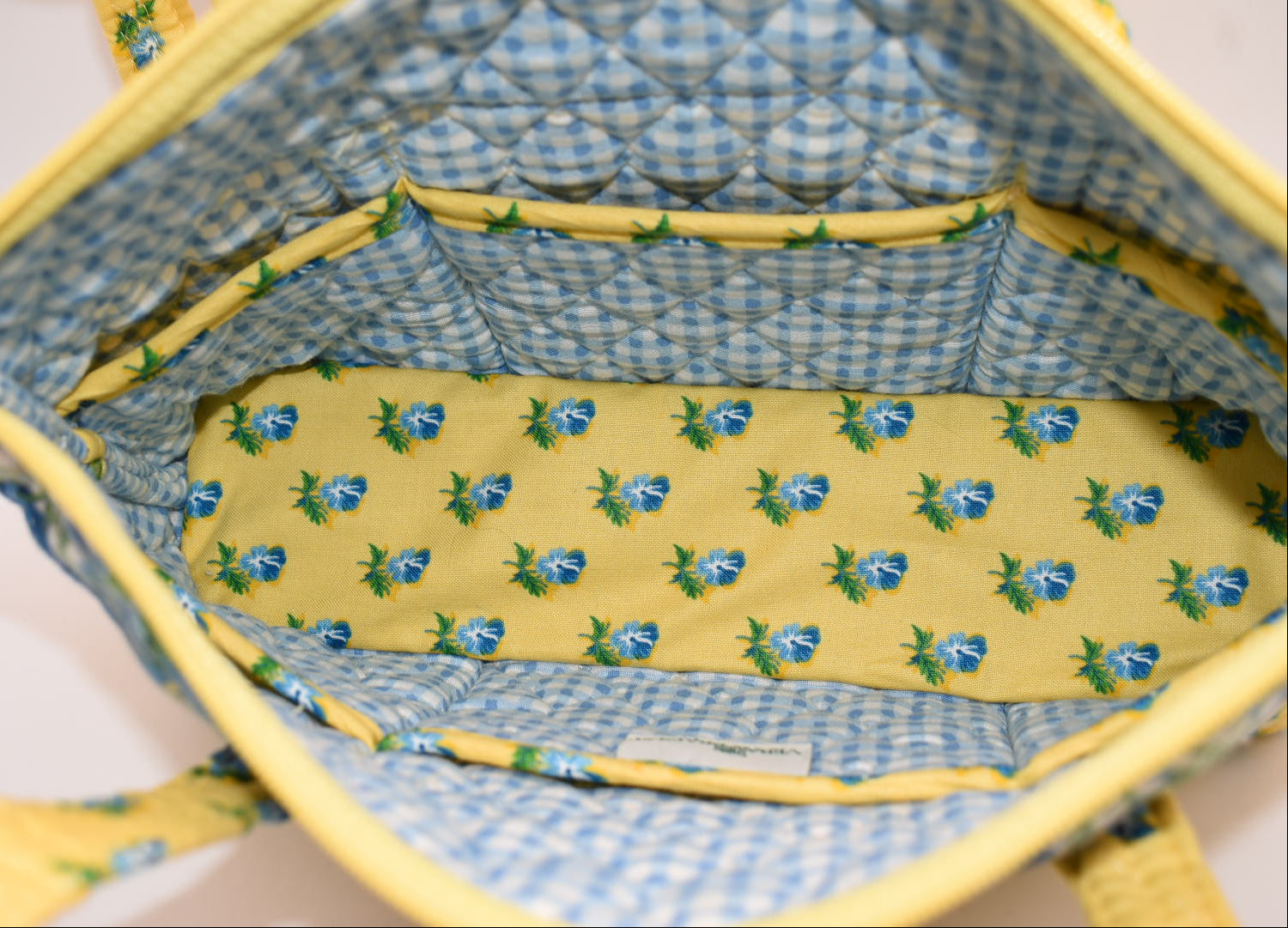 With a zippered top, contrasting interior fabric, one exterior slip pocket and six interior slip pockets, this little tote bag is big on both organization and style.