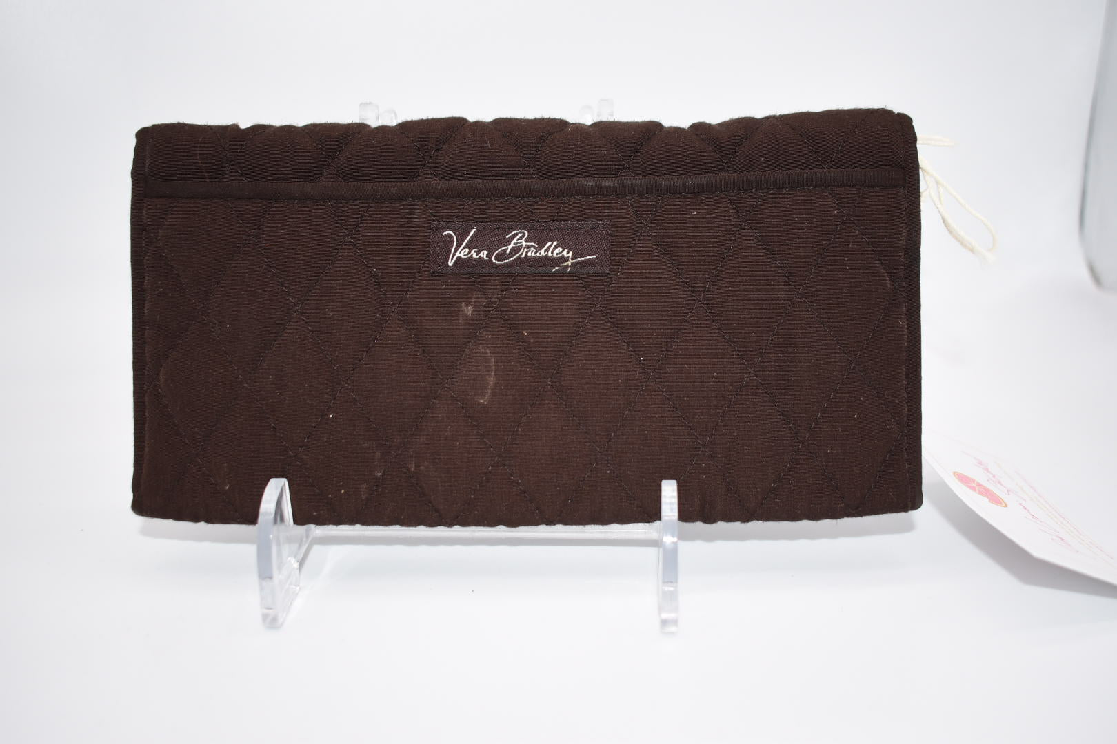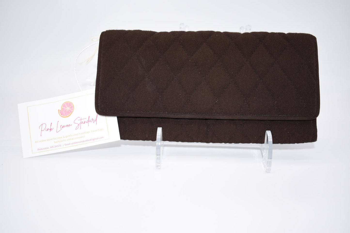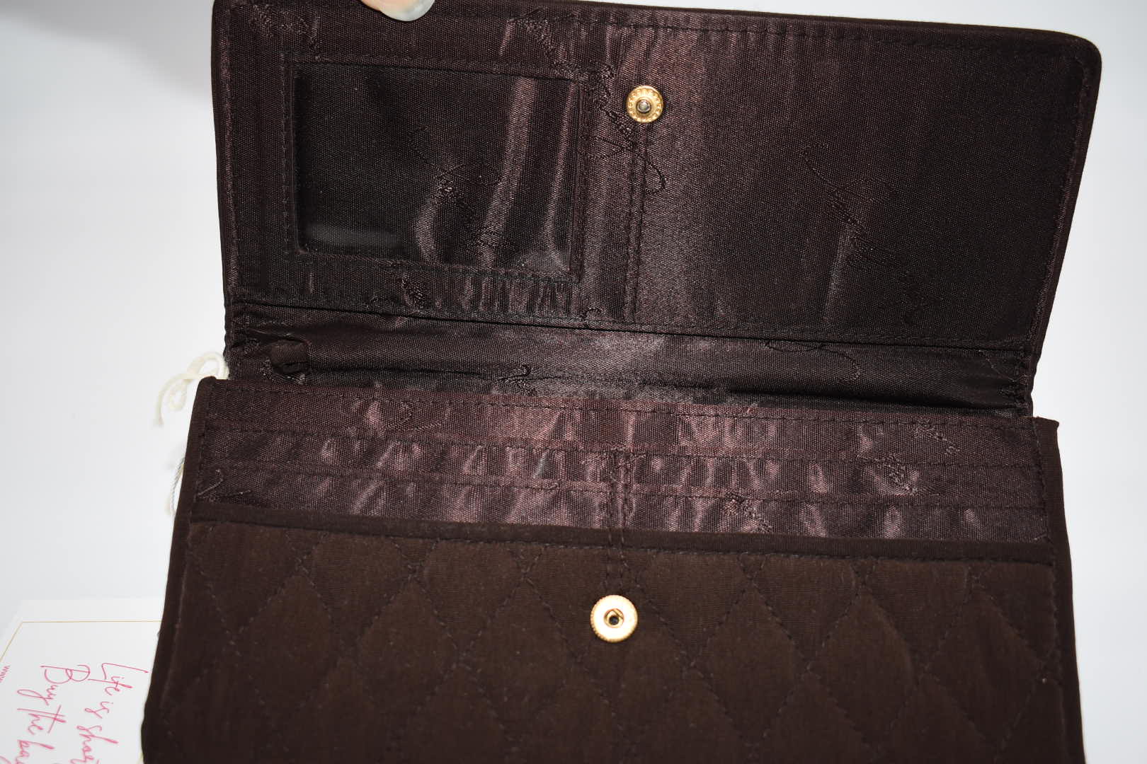 Homespun quilting lends a soft look to this vibrantly patterned wallet. The back zip pocket secures small essentials, and the clear interior windows equal fuss-free ID checking.