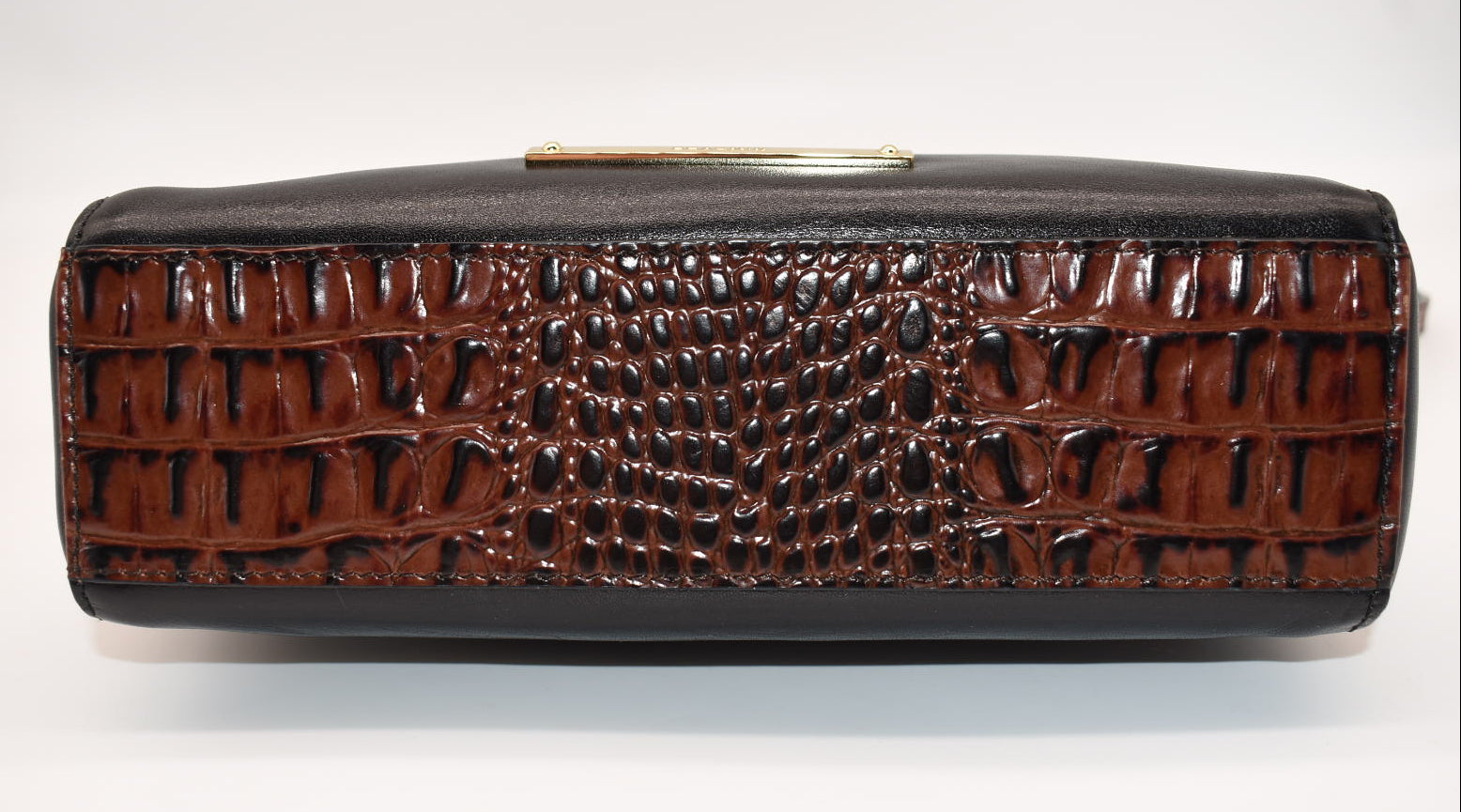 A slender strap in signature croco-embossed leather lends day-to-evening versatility to Brahmin's spacious handbag that doubles as a ladylike clutch.